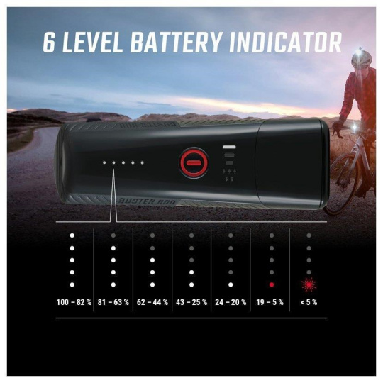 Světlo Buster 800 se zapíná dvojitým stisknutím tlačítka a vypíná se dlouhým stisknutím tlačítka. Tato funkce zabraňuje neúmyslnému zapnutí/vypnutí např. v batohu, kapse. Velké tlačítko zapnutí lze snadno ovládat i v rukavicích.