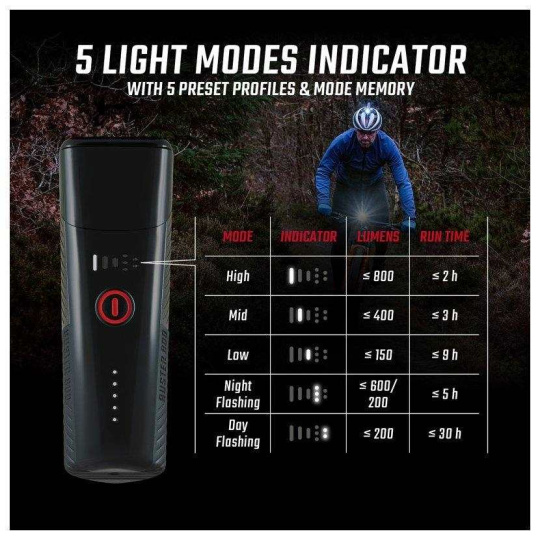 Od soumraku až do hluboké noci – světlo BUSTER 800 je díky pěti různým světelným režimům vhodné pro všechny světelné podmínky. V režimu High dosahuje světlo BUSTER svítivosti 800 lumenů po dobu až 2 hodin, takže osvětlí i ta nejtemnější cesty. Režim Mid vydrží svítit na cesty až 3 hodiny s intenzitou nejméně 400 lumenů. A kdyby se náhodou vyjížďka protáhla, vydrží režim Low spolehlivě svítit až 9 hodin. Režimy blikání Night Flashing a Day Flashing zajistí dobrou viditelnost po dobu až 30 hodin. LED kontrolky signalizující režimy zobrazení ihned prozradí, který z pěti světelných režimů se aktuálně používá.