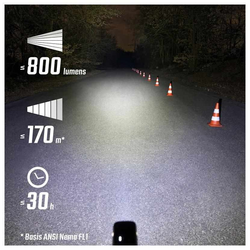 Se světlem Buster 800 s CREE LED uvidíte parádně i ve tmě a nic vám nebrání v nočních dobrodružstvích. Svítivost 800 lumenů a dosvit 170 metrů se postarají o optimální osvětlení i těch nejtemnějších cest. Pět různých světelných režimů nabízí flexibilitu při kombinaci intenzity světla a výdrže baterie. Indikátory LED na horní straně světla přehledně zobrazují, jaký režim je momentálně vybrán a jak dlouho ještě vydrží baterie. Můžete být v závislosti na světelném režimu na cestách až 30 hodin. Pět přednastavených režimových profilů se postará o extra uživatelský komfort.