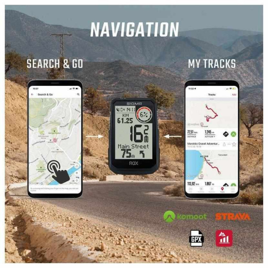 Díky navigaci „Search & Go“ můžete rychle najít jakékoli místo na mapě a následně k němu naplánovat trasu. Chcete-li to provést, musíte zadat adresu do aplikace SIGMA RIDE na vašem smartphonu nebo kliknout na libovolný bod na mapě. Je možné individuálně definovat preference silnic (cyklostezky, nezpevněné cesty, běžné silnice a pěší cesty/turistické stezky). Vytvořenou trasu lze spustit přímo na počítači ROX 4.0 Endurance nebo uložit pro pozdější použití v aplikaci SIGMA RIDE.