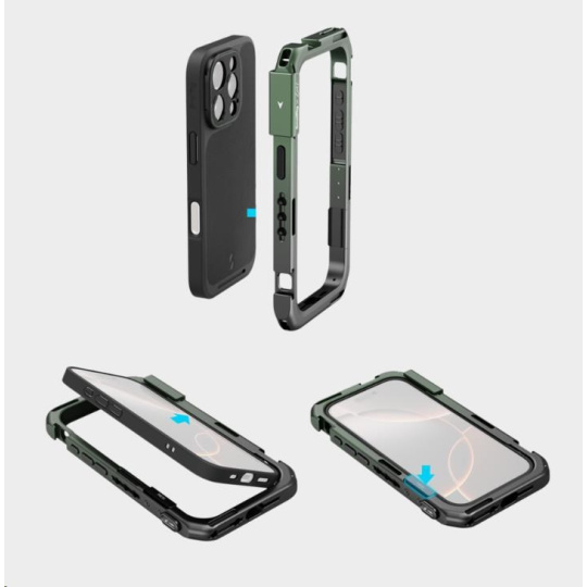 Telefon lze rychle upevnit do klece, která je vybavena několika otvory se závitem 1/4"-20 proti otáčení a úchyty pro studenou botku, a rozšířit ji tak o příslušenství, jako jsou rukojeti, stativy, mikrofony a světla, což zvyšuje zážitek z fotografování, zatímco integrovaná rozhraní pro rychloupínání zajišťují bezproblémové připojení.