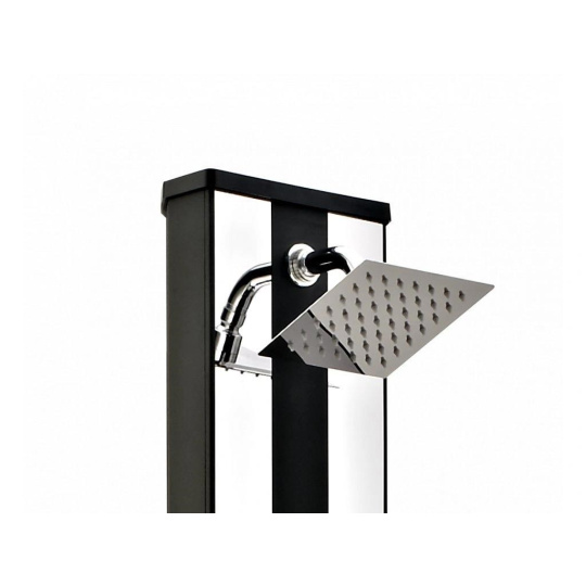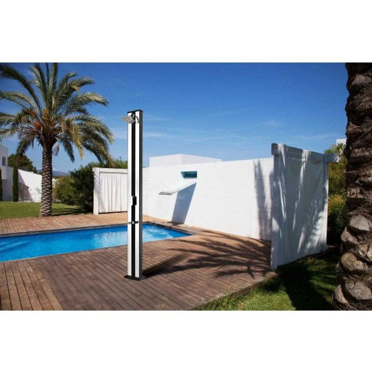 Hliníková solární sprcha s XXL zásobníkem o objemu 38 l a velkou sprchovací hlavicí, která zajišťuje příjemné sprchování připomínající lehký letní deštík. Sprcha je vyrobena z hliníku a nerezu, má kovovou pákovou baterii a je vysoká 218 cm. Je vybavena praktickým kohoutkem na oplach nohou. Celkově je sprcha velmi kvalitně zpracována a má luxusní vzhled. Připojení na přívod vody je velmi jednoduché pomocí hadicové rychlospojky (součástí balení).