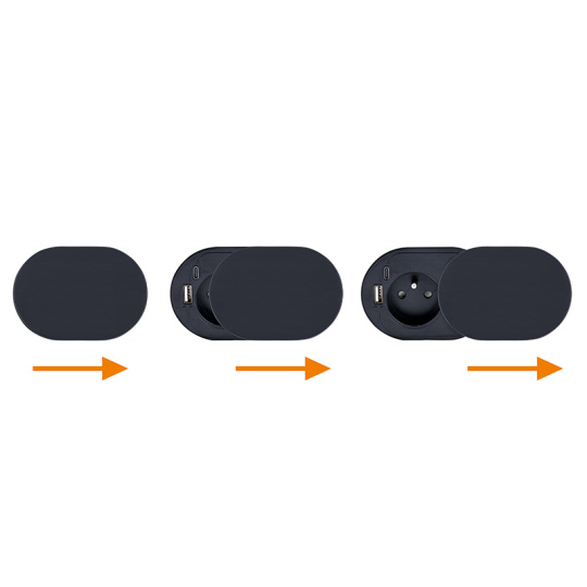 Posuvné víčko chrání zásuvky i USB porty před prachem, nečistotami nebo kapalinami a umožňuje zakrýt pouze část, kterou momentálně nepoužíváte. Vrchní kryt z broušené nerezové oceli v matné černé úpravě je nejen odolný, ale také esteticky příjemný, takže zásuvka snadno zapadne do každého interiéru.