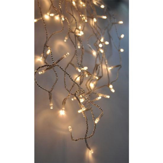 Počet LED diod: 360, styl uspořádání: visící rampouchy, pro venkovní i vnitřní použití, barva světla: teplá bílá (žlutá), 8 nastavitelných módů svícení/blikání, časovač 6h/18h - po 6h od zapnutí se automaticky vypne a znovu zapne po 18h, rozestupy rampouchů: 13cm.