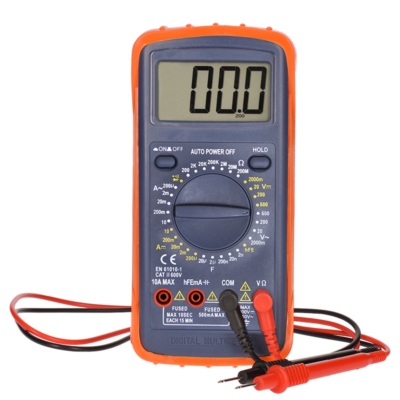 Digitální multimetr pro měření napětí, proudu, odporu a kapacity. Nabízí test spojitosti obvodu, diodový test a měření hFE (0-1000). Funkce automatického vypnutí a uchování poslední hodnoty. Ochrana proti přetížení a indikace vybité baterie. Napětí: DC 2000mV - 600V (± 0,5%), AC 2000mV - 600V (± 1%), proud: DC 200uA - 10A (± 1,8%), rezistence: 200? - 200M? (± 1%). Kapacita: 2nF - 20uF (± 4%). Napájení: 9V baterie (nejsou součástí balení). Rozměry: 193x90x37 mm, hmotnost: 251g..... více