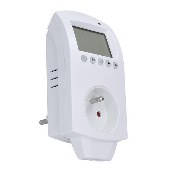 termostaticky spínaná programovatelná zásuvka pro vnitřní použití, spíná při dosažení nastavené teploty možnost nastavení různých režimu pro vytápění nebo chlazení (až 6 režimů pro 24h) možnost nastavení pro všední den a víkend časový spínač, umožňuje zásuvku zapnout nebo vypnout automatický režim/režim ručního nastavení přesnost měření teploty ±1°C rozsah nastavení teplot 5°C až 35°C vlastní spotřeba 0,3W krytí IP20 napájení: 230V/50Hz, max. zatížení 16A, 3680W.