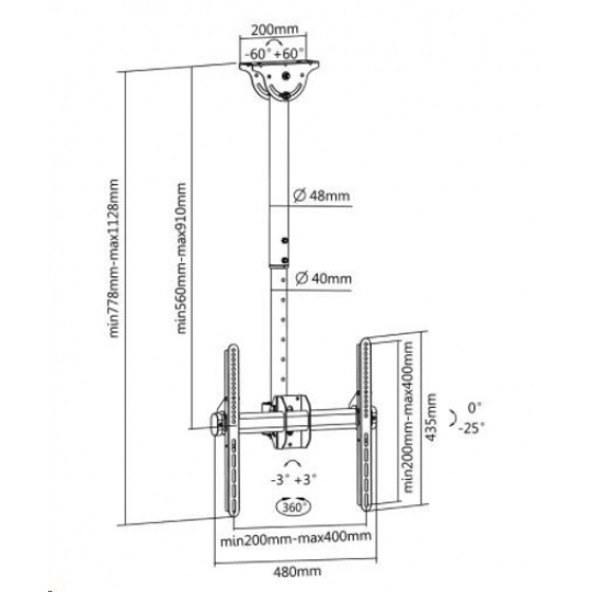 Stropní držák televize Fiber FN-T400    Stropní držák na Tv 32-60" plně polohovatelný, TOP kvalita     Držák pro zavěšení televizorů a monitorů na stropní konstrukce. Držák je plně nastavitelný: otáčení do stran, náklon, délka od stropu, korekce roviny, i na šikmé stropy +/-60°, možnost kolmého otočení úchytu a instalace i na svislé plochy. Celoocelová konstrukce s vynikající pevností, možnost zavěsit televizory s hmotností i 50kg.  Top kvalita, plná nastavitelnost, spolehlivost a bezpečnost, to jsou hlavní přednosti tohoto stropního držáku na televizory a monitory.      Profesionální stropní držák na televize i monitory 32-65 palců, otočný do stran, možnost velkého náklonu, délkové nastavení, systém skrytého vedení kabeláže, nosnost 50kg. Stropní držák Tv Fiber FN-T400     Technické údaje:   nosnost 50kg podpora VESA 200x100 až 400x400 na televize a monitory s úhlopříčkou 32" až 60" (dle VESA a hmotnosti i větší) nastavení délky držáku 560mm až 910mm otáčení do stran +/- 180° náklon 0° až -25° korekce roviny obrazu +/- 3° možnost zavěšení na vodorovné i na šikmé stropní konstrukce +/- 60° možnost zavěšení i na svislé plochy ocelová konstrukce výborné kvality systém pro skryté vedení kabeláže barevné provedení černé záruka 5 let    Stropní držák na televize a monitory Fiber FN-T400 podporuje VESA standardy:   VESA 200x100 VESA 200x200 VESA 300x100 VESA 300x200 a 200x300 VESA 300x300 VESA 400x200 a 200x400 VESA 400x300 a 300x400 VESA 400x400.