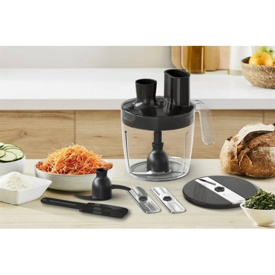 Tefal HB67G830 Quickchef+ 5v1 Black vám poskytne více nástrojů pro usnadní práce v kuchyni. Kompaktní sekáček slouží pro sekání a mletí. Se šlehací metlou zase připravíte lahodné krémy či domácí majonézu. Mixovat můžete pomocí Tefal HB67G830 v dodávané odměrné nádobě.