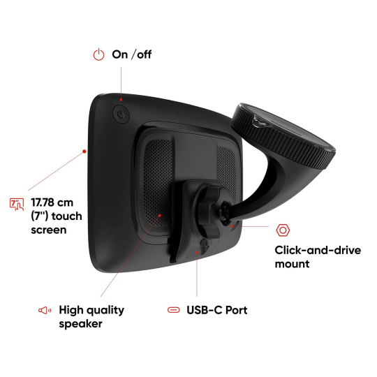 Na 7" dotykové obrazovce si můžete prohlédnout svou trasu ve vysokých detailech. A díky ovládání pomocí hlasových příkazů můžete zařízení GO Camper Max ovládat, aniž byste museli sundat ruce z volantu. Snadno použitelný držák Click-and-Drive navíc drží navigační zařízení bezpečně na místě.
