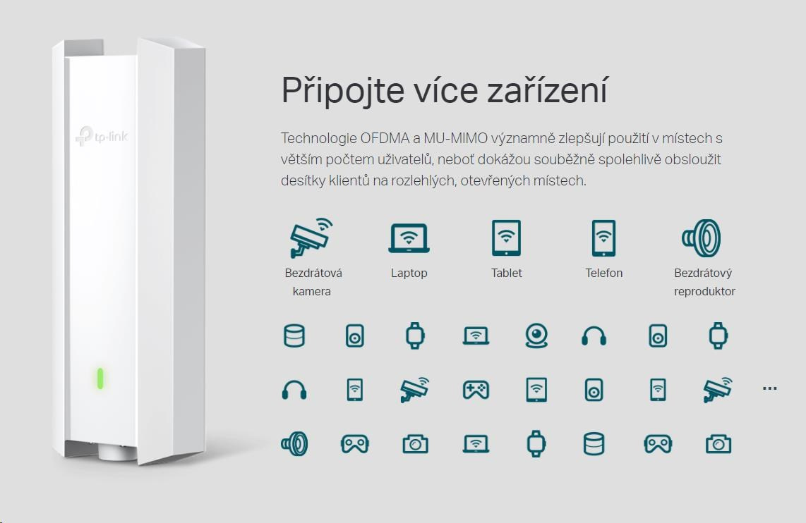 - Vyšší efektivita sítě: Technologie OFDMA a MU-MIMO přinášejí vyšší rychlosti a nižší prodlevu u většího počtu zařízení.