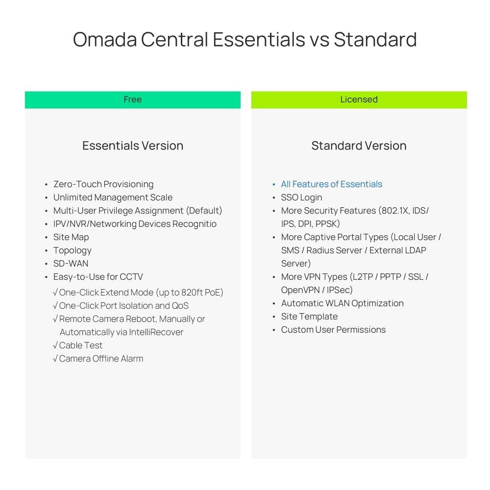 | Centralized Management | • Unlimited centralized management scale • Centrally manage Omada access points, JetStream switches, and SafeStream routers |