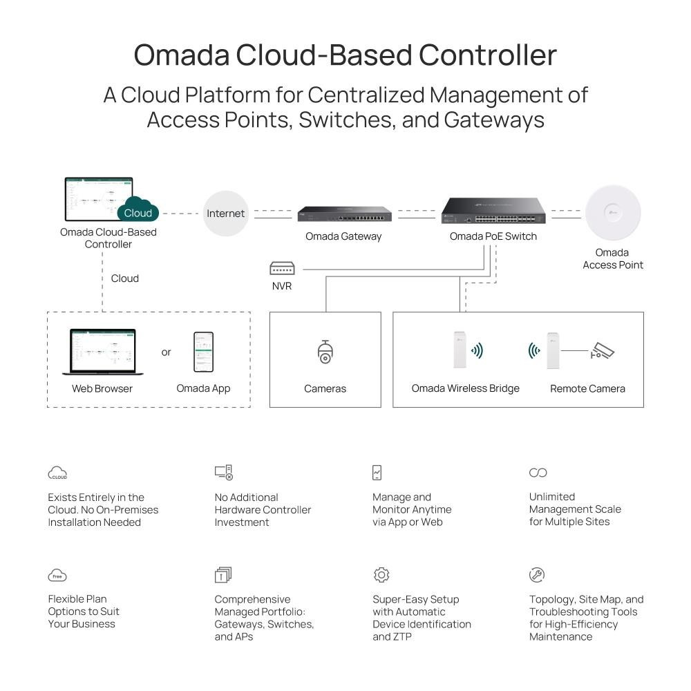 Cloudový kontroler Omada, existující kompletně v cloudu pro platformu softwarově definovaných sítí Omada (SDN), poskytuje 100% centralizovanou cloudovou správu přístupových bodů, switchů a bran – to vše z jednoho rozhraní. Není třeba investovat do dodatečného hardwaru nebo provádět instalaci na místě u zákazníka.