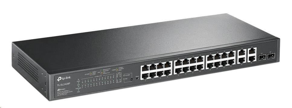 Inteligentní switch TP-Link TL-SL2428P je vybaven 24 porty RJ45 10/100 Mbit/s, 4 porty RJ45 10/100/1 000 Mbit/s a 2 kombinovanými gigabitovými SFP sloty. Všech 24 portů RJ45 10/100 Mbit/s podporuje standard 802.3at/af (PoE+) s celkovým rozpočtem napájení PoE 250 W* a užitečnými funkcemi řízení spotřeby PoE. Switch poskytuje vysoký výkon, technologii QoS na podnikové úrovni, užitečné strategie zabezpečení a bohaté funkce správy na 2. vrstvě.