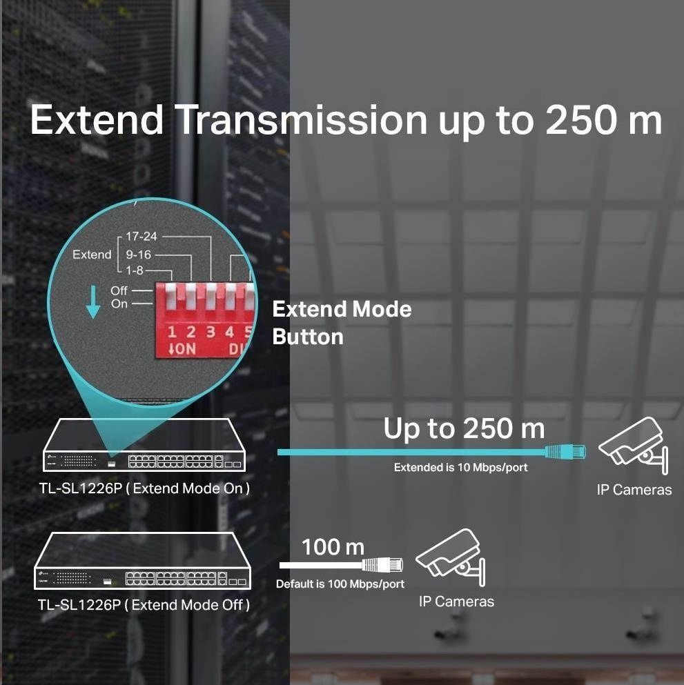 - Přenos dat a PoE napájení až do vzdálenosti 250 m v režimu prodloužení, speciálně navrženého pro dohledový systém