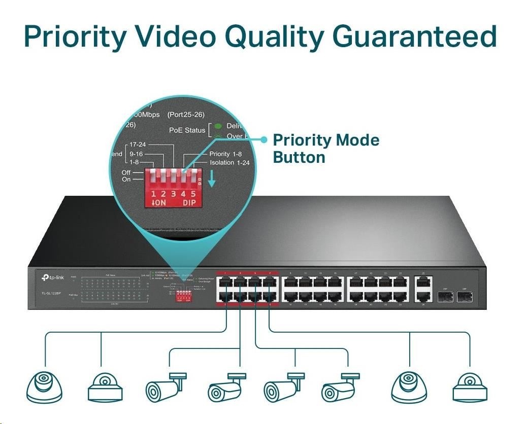 - Prioritní režim zajišťuje vysokou prioritu portů 1–8 a zaručuje kvalitu citlivých aplikací, jako je video monitor