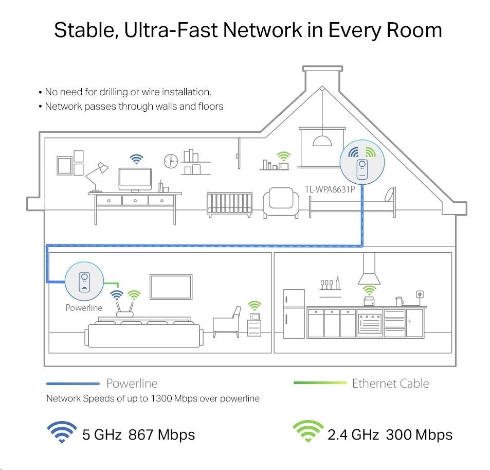 - Dvoupásmová síť Wi-Fi AC1200 – zařízení rozšíří ultra rychlou dvoupásmovou Wi-Fi síť s rychlostí až 867 Mbit/s v pásmu 5 GHz a až 300 Mbit/s v pásmu 2,4 GHz.