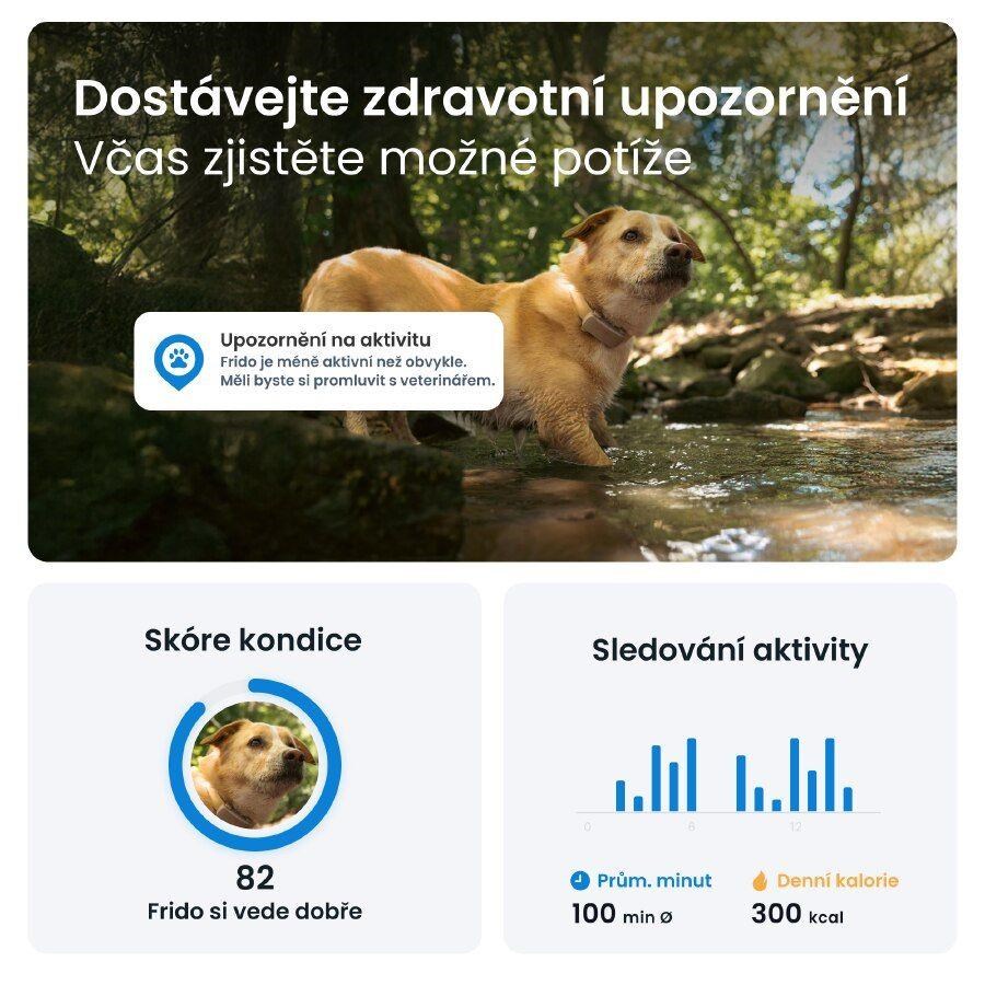 GPS tracker Tractive vás informuje, jak moc se váš pes pohybuje, spí a štěká. Můžete nastavit cíle pohybu, kontrolovat Skóre kondice a porovnávat svého psa s jinými plemeny.Odolná konstrukce