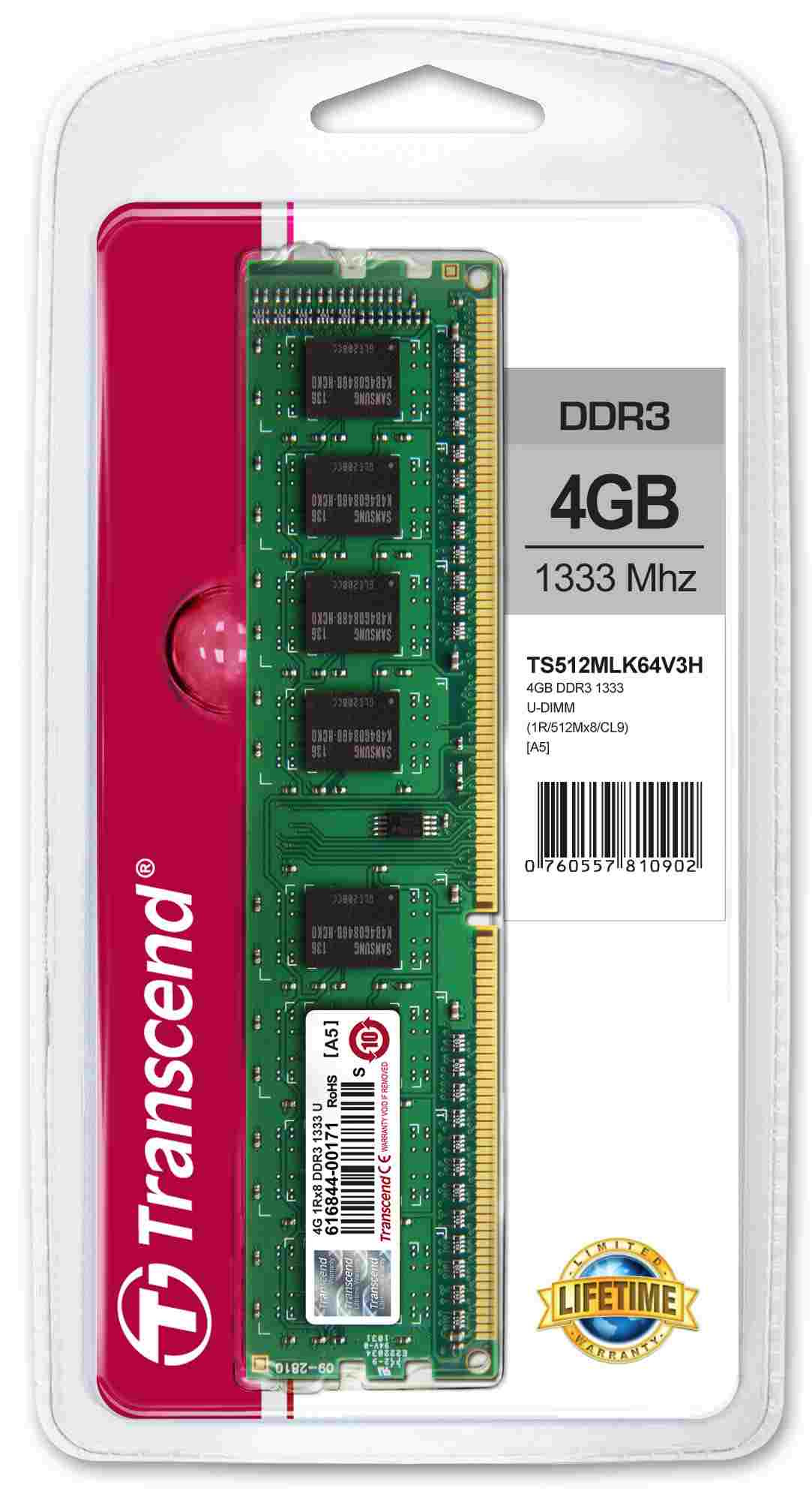 TRANSCEND DIMM DDR3 4GB 1333MHz 1Rx8 CL9 - BULK