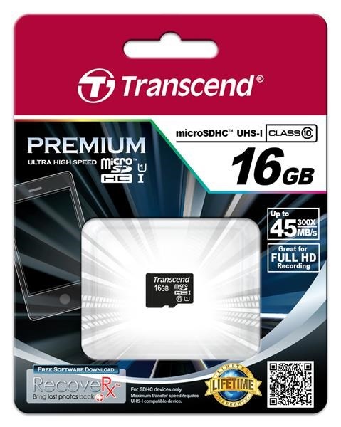 TRANSCEND MicroSDHC karta 16GB Premium, Class 10 UHS-I 300x, bez adaptéru