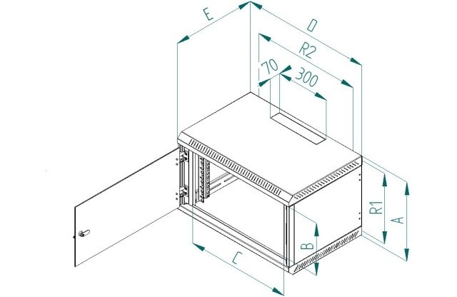 Rozvaděč Delta B je celosvařený nástěnný jednodílný rozvaděč s celoskleněnými dveřmi, které je možné díky masivním pantům otevřít pod úhlem téměř 180°. Důležitou součástí výrobku jsou otvory pro kabely, které jsou umístěny na horní a dolní stěně. Další dva otvory jsou umístěny na zadní stěně rozvaděče. Otvory jsou zaceleny vylamovacími záslepkami, které je možné vylomit s pomocí např. šroubováku. 19“ zařízení se instalují na vertikální lišty, které je možné plynule natavit podle potřeby do hloubky těla rozvaděče. Díky perforaci je zajištěna přirozená cirkulace vzduchu a chlazení komponentů. Přesné rozměry a další technické údaje jsou uvedeny níže (hodnoty R1 a R2 označují rozteče montážních otvorů pro zavěšení rozvaděče na zeď). Maximální zatížení rozvaděče je 30 kg. Rozměry: A – 280 mm B – 175 mm C – 490 mm D – 600 mm E – 395 mm R1 – 234 mm R2 – 420 mm Hmotnost – 12,4 kg Příbal: Klíč - přední dveře 2x Vrut 6x50 4x Podložka 6,6 4x Hmoždinka 10 4x Plastová podložka 8x Plovoucí matice M6 8x Šroub M6x16 8x Protiprachová záslepka 1x.