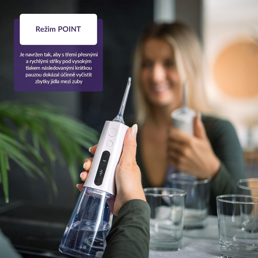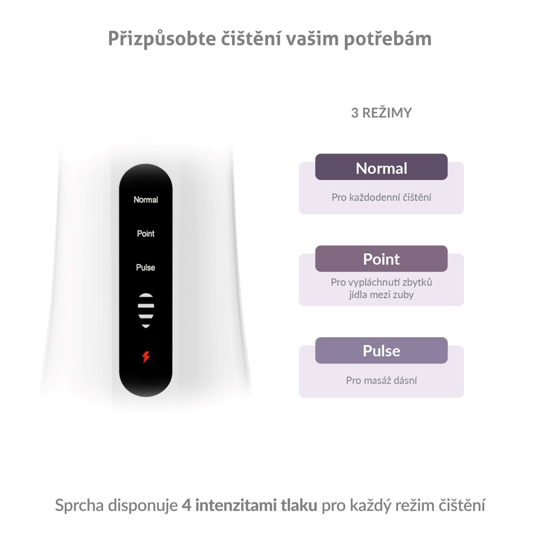 Sprcha nabízí 3 režimy čištění s různými intenzitami tlaku (30 – 130 PSI), včetně režimu POINT, který cíleně a účinně odstraní zbytky jídla z mezizubních prostor.