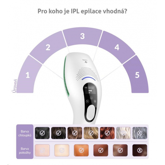 Dopřejte si viditelně hladší pokožku již po 4 týdnech používání epilátoru TrueLife BELLE IPL E5. Epilátor, který pracuje s technologií TrueIPL®, vás při pravidelném používání účinně zbaví nežádoucích chloupků. S epilátorem snadno ošetříte všechny partie těla, obličej a podpaží, oblast bikin i celé nohy. To vše díky technologii SensCool® zcela bezbolestně, šetrně a bezpečně. Epilátor vysílá záblesky, které pod povrchem pokožky zasahují melanin ve folikulu chloupku a napomáhají tak přerušit cyklus dorůstání chloupků. Pravidelné používání TrueLife BELLE IPL E5 zanechá vaší pokožku sametově hebkou, bez nutnosti holení nebo nákladných a bolestivých kosmetických ošetření. Použití epilátoru je snadné a zvládne jej každý. Kromě klasické lampy k odstraňování chloupků v balení najdete i speciální SR lampu k omlazení pokožky a AC lampu, která vám pomůže s odstraněním akné.