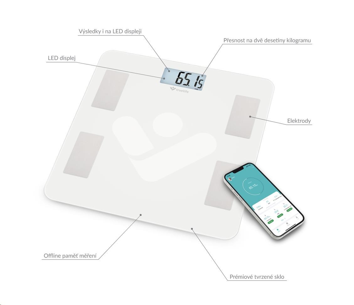 Osobní váha TrueLife funguje na principu bioelektrické impedanční analýzy (BIA), kterou běžně využívají vrcholoví sportovci. S váhou TrueLife FitScale W4 BT dokonale porozumíte své tělesné kompozici z pohodlí domova. Váha měří celkem 15 indexů, včetně BMI, podkožního tuku, metabolického věku a podílu svalové nebo kosterní hmoty. Vývoj všech hodnot lze sledovat v mobilní aplikaci, se kterou váhu snadno spárujete pomocí Bluetooth.
