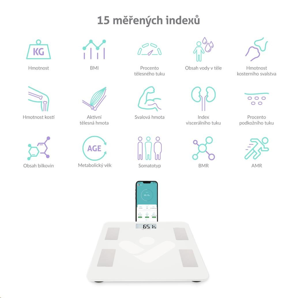 Inteligentní váha s Bluetooth, aplikace v CZ, měření 15 tělesných indexů, paměť pro 12 uživatelů, kompletní historie měření v aplikaci, Health Report - statistiky, grafy, nastavování cílů, doporučení, technologie bioelektrické impedance (BIA), kompatibilita s Apple Health Kit, Google Fit, FitBit, odchylka vážení 0.1 kg, tvrzené sklo, LED displej, offline režim, napájení: 2 x 1.5V AAA baterie..... více