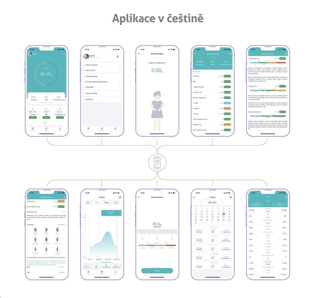 V aplikaci, do které se ukládá kompletní historie vašich měření, naleznete v sekci Health Report. Zde je každý měřený index podrobně vysvětlen, a vaše hodnoty zobrazeny na škále. U každého indexu pak naleznete doporučení ohledně stravy a cvičení, abyste si udrželi zdravý životní styl. Zároveň vám ukáže jak se efektivně držet svých cílů, ať už se snažíte nabrat svalovou hmotu, či redukovat tělesný tuk. Díky množství informací, grafů a statistik, které jsou dostupné přímo v aplikaci, nepotřebujete nic složitě zaznamenávat.