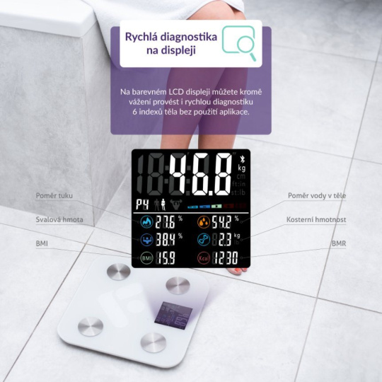 Výsledky rychlé diagnostiky pomocí bioelektrické impedanční analýzy vidíte na displeji během chvíle, 7 indexů těla i bez použití aplikace.
