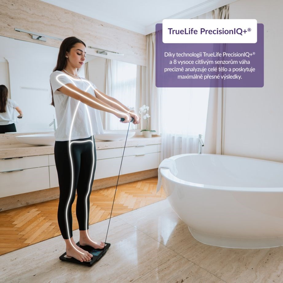 TrueLife FitScale W8 BT Black – Rozumí vašemu tělu do detailu Zjistěte o svém těle více než jen pouhou hmotnost. Každý jsme originál a jedinečnou skladbu má i naše tělo, proto o něm chytrá váha TrueLife FitScale W8 BT Black prozradí detaily. Technologie TrueLife PrecisionIQ+® využívá 8 vysoce citlivých senzorů a s pomo... více