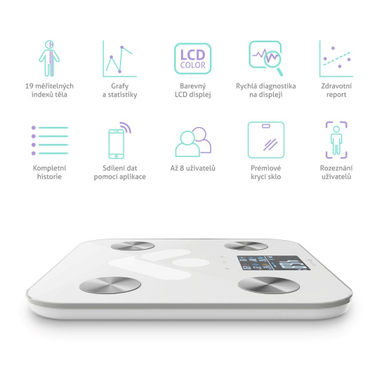 Váha umí automaticky rozpoznat až 8 uživatelů a zapamatovat si jejich údaje. Navzájem si tak mohou porovnávat výsledky a sledovat své pokroky.