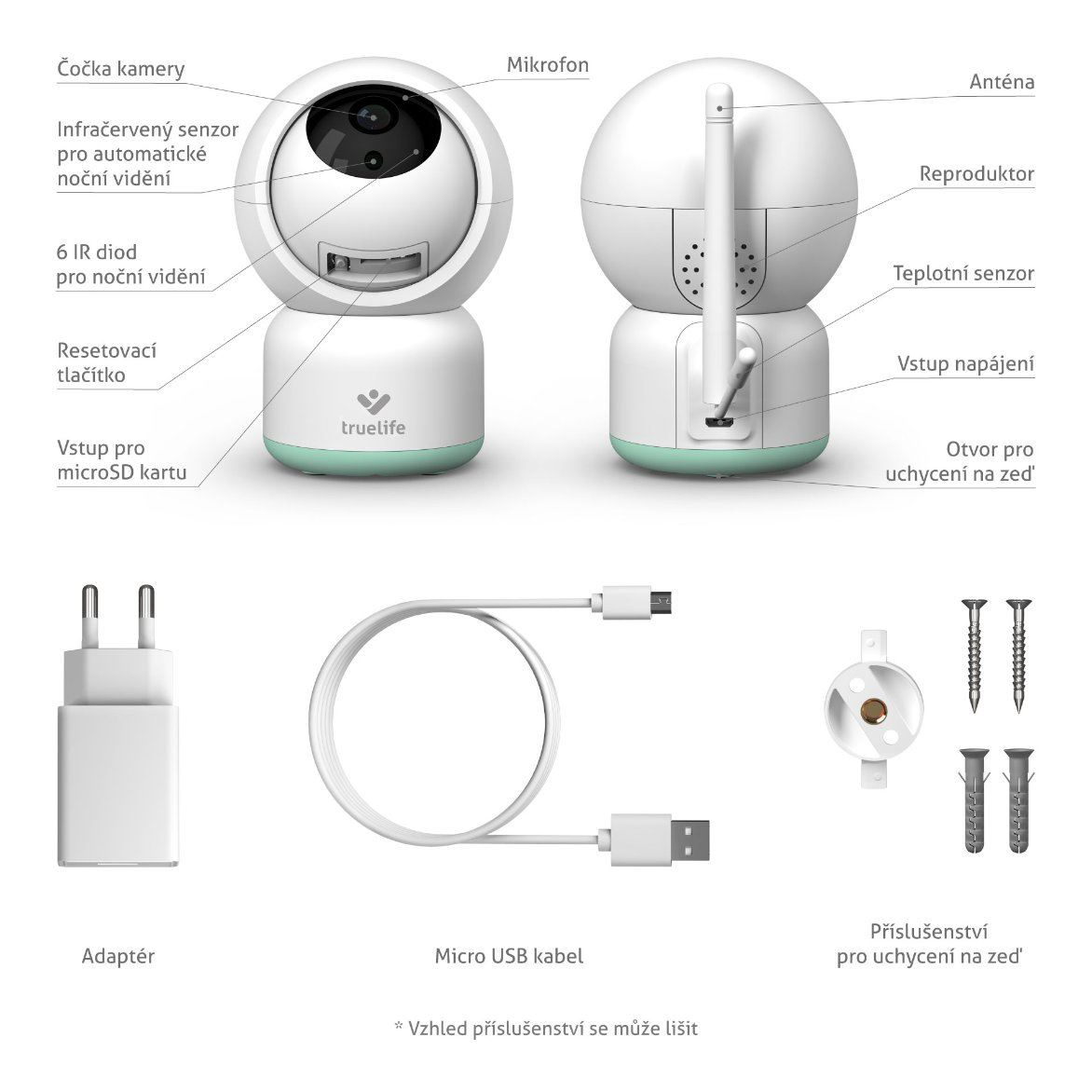 Rotační chůvička s aplikací TrueLife Smart v českém jazyce, neomezený dosah, Full HD video, detekce pohybu, zvuku a teploty, sledování a otáčení za pohybem, automatické noční vidění, obousměrná komunikace, ukolébavky, pořízení fotografií a videí, sdílení účtu s více členy domácnosti, zabezpečení proti hacknutí s pětivrstvou bezpečnostní technologii, nepřetržité nahrávání videa 24/7 na microSD kartu, nastavení hlasitosti, cloudové uložiště.... více