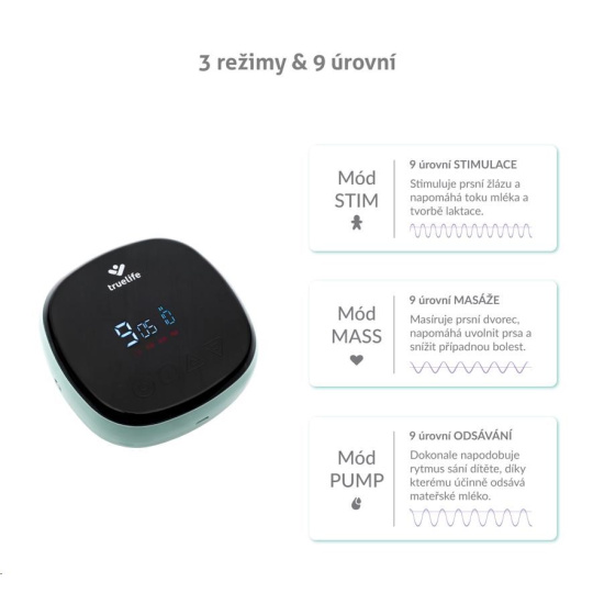 Kromě odsávání můžete zvolit ještě mód stimulace, nebo masáže. U každého módu máte na výběr z devíti úrovní, takže si odsávačku nastavíte přesně tak, jak vám vyhovuje.