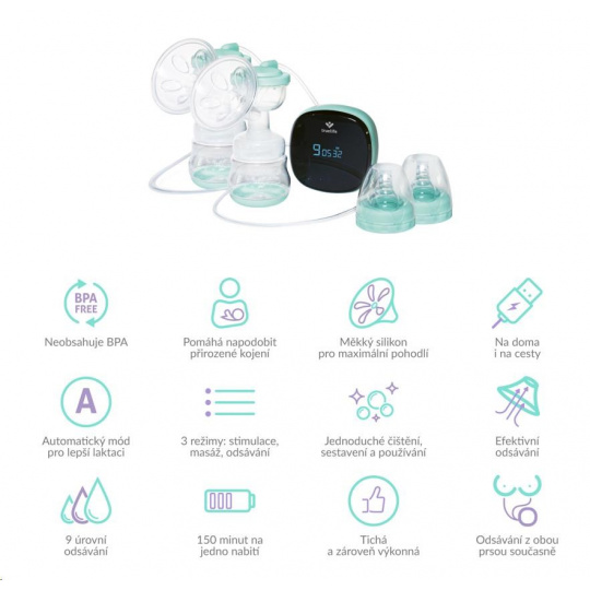 Dvojitá prsní odsávačka Nutrio BP Electric Double, která odebírá mléko z obou prsou současně, vám pomůže vyřešit nedostatek nebo přebytek mateřského mléka rychleji, než klasická odsávačka. Zároveň je výhodnější pro pravidelné používání, ať už potřebujete odsávat ze zdravotních, nebo časových důvodů. Pomocí dvojité odsávačky navíc odsajete v průměru o 18 % více mléka, než při odsávání z každého prsu zvlášť. Mléko, které získáte odsáváním z obou prsou současně, má dle výzkumů vyšší obsah tuku a kalorií. Nutrio BP Electric Double je díky technologii MilkFlowStimulation® vhodná i pro maminky, které mají problémy s laktací nebo s kojením obecně. Pomůže ale i v situacích, kdy se děťátko nechce samo přisát k prsu. K ovládání odsávačky a sledování průběhu odsávání slouží intuitivní displej s několika dotykovými tlačítky a časovačem. U tří módů máte na výběr devět úrovní, takže si intenzitu odsávání nastavíte tak, aby vám to bylo pohodlné.