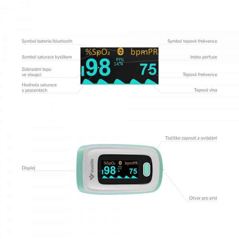 Pulzní Oxymetr Truelife X5 BT je malý praktický přístroj, se kterým snadno, okamžitě a bezbolestně zjistíte saturaci krevního hemoglobinu kyslíkem, tepovou frekvenci a perfuzní index. Malý přístroj, který jednoduše umístíte na prst je ideálním pomocníkem pro osoby s respiračním onemocněním, onemocněním srdce, astmatiky, ale i vrcholové sportovce. Oxymetr je vybaven OLED displejem, který zobrazuje naměřené hodnoty. Displej nabízí nastavitelnou intenzitu jasu a 6 režimů zobrazení měřených hodnot. Oxymetr TrueLife X5 BT spolehlivě změří váš tep i saturaci krve kyslíkem v pohodlí domova, bez nutnosti návštěvy lékaře a bez bolesti. Díky zabudovanému Bluetooth lze oxymetr spárovat s telefonem a hodnoty měření uchovávat v mobilní aplikaci.