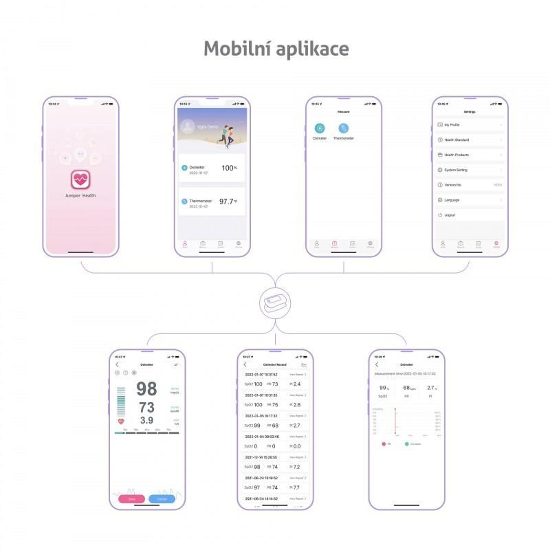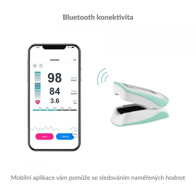 Díky zabudovanému Bluetooth lze oxymetr spárovat s chytrým telefonem a hodnoty měření uchovávat v mobilní aplikaci.