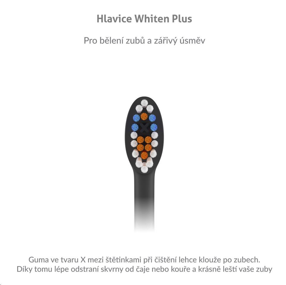 Náhradní hlavice jsou speciálně vyvinuty pro bělení zubů. Guma ve tvaru X mezi štětinkami při čištění lehce klouže po zubech. Díky tomu lépe odstraní skvrny od čaje nebo kouře a krásně leští vaše zuby.
