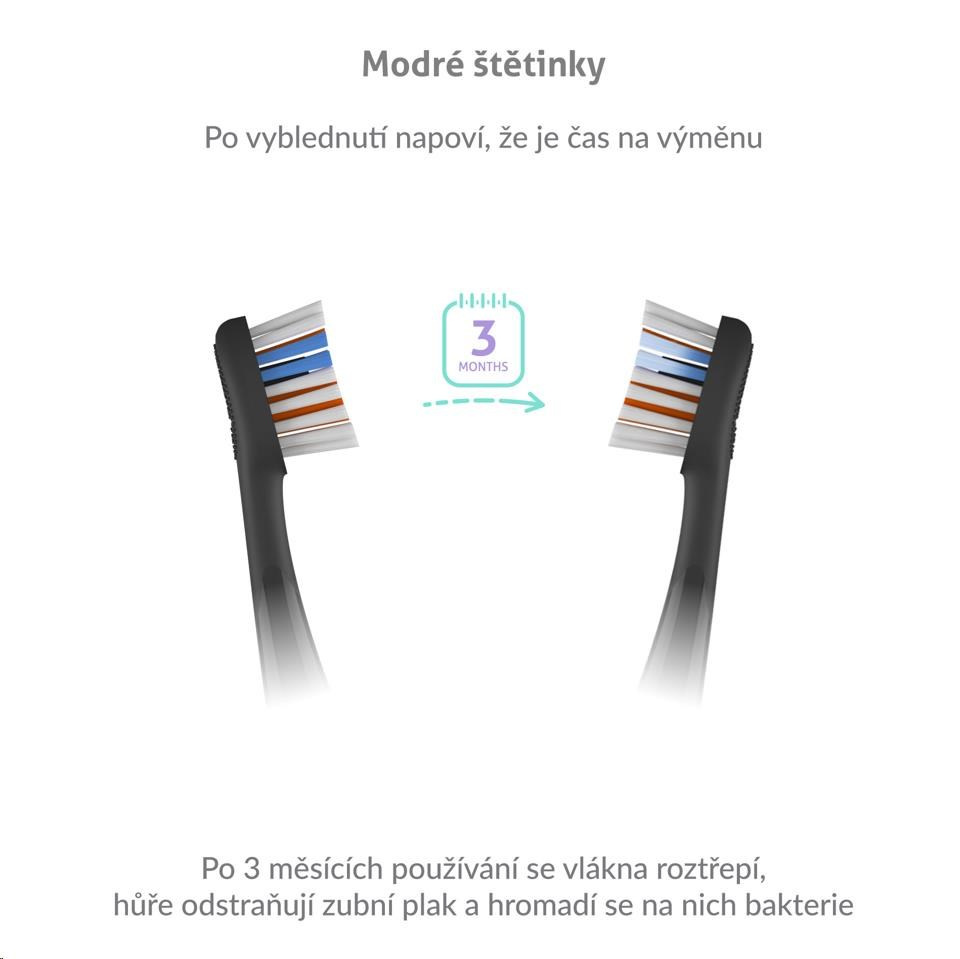 Hlavice vydrží až 3 měsíce používání, poté se začnou třepit, ztrácí účinnost a navíc se na nich hromadí bakterie. Naštěstí jsou hlavice opatřeny modrými štětinami, které po 3 měsících vyblednou a vy tak víte, že je načase hlavice vyměnit.