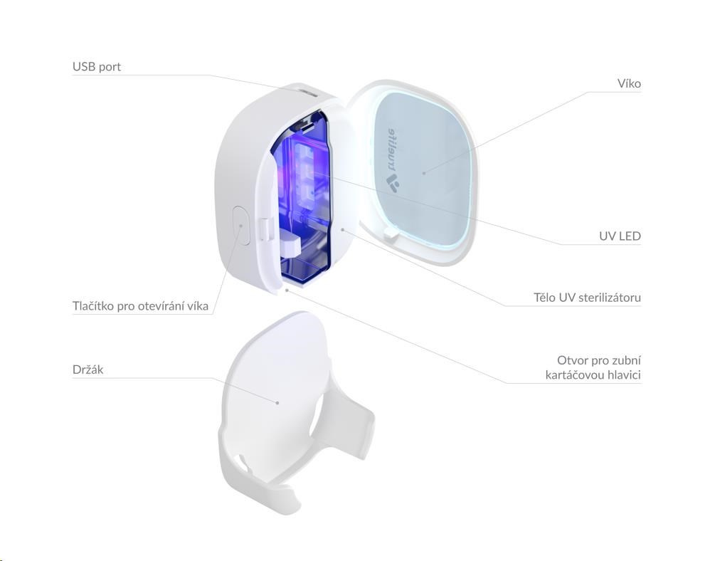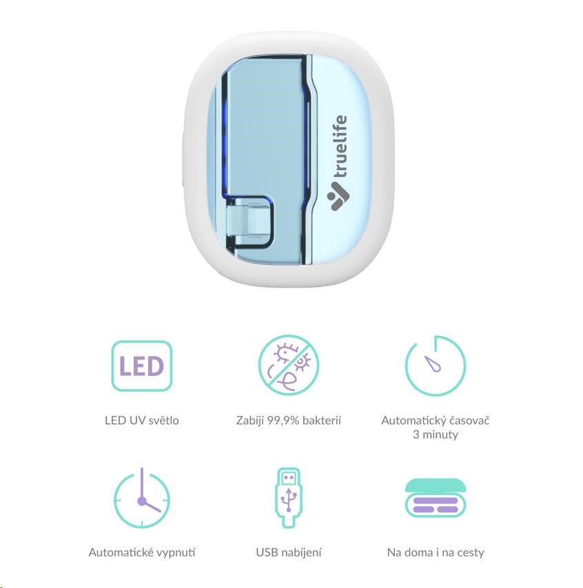 UV sterilizátor od TrueLife je malý přístroj, který efektivně ničí bakterie usazující se na hlavicích zubních kartáčků. Díky UV-C záření o vlnové délce 200-275 nm proniká k membránám bakterií, virů a plísní a zabraňuje jejich šíření. Je kompatibilní s většinou hlavic elektrických i manuálních kartáčků na trhu.