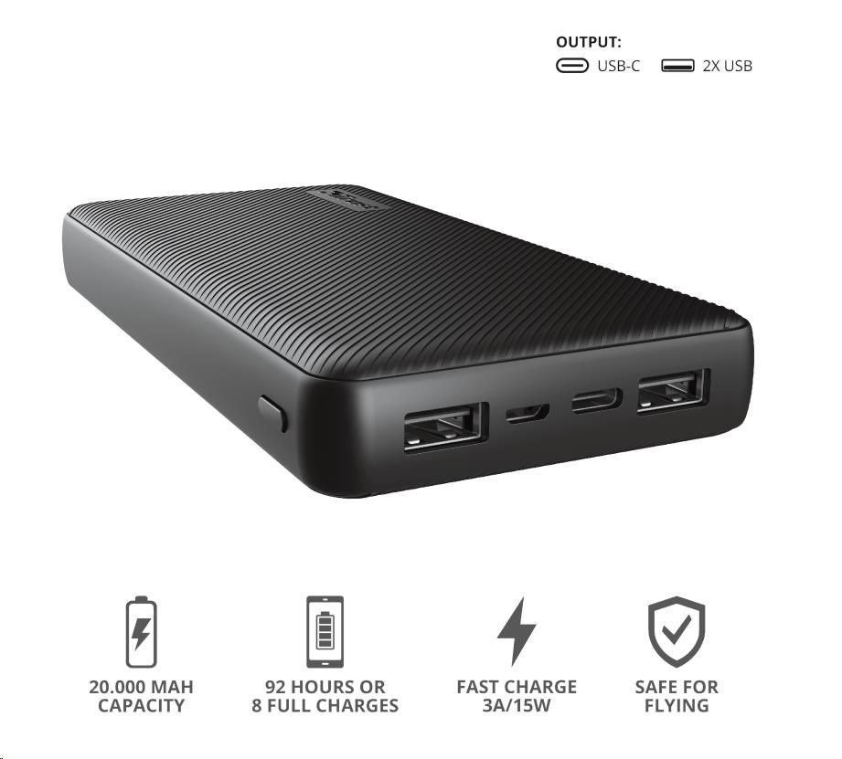 Fast and high-capacity powerbank for up to 92 extra device hours (20.000 mAh)