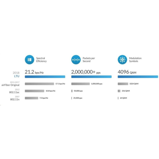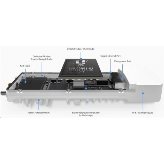 AF-5XHD je v současné době nejvýkonnějším a nejlépe vybaveným airFiber zařízením od Ubiquiti Networks. Revoluční procesor s označením airFiber LTU IC doáže zpracovat přes 2 miliony+ paketů za sekundu při 1Gbps+ (TDD) reálného datového toku v bezlicenčním pásmu 5GHz při 1024QAM (v plánovaném firmwaru je počítáno s podporou až 4096QAM s ještě vyšší propustnosí). Mezi další klíčové vlastnosti můžeme zařadit 2x Gigabit LAN, kdy jeden port je určen pouze pro management, časová synchronizace přes GPS, dedikovaný spektrální analyzér, vysoká odolnost proti vodě (IP67) a nastavitelná šířka kanálu 10/20/30/40/50/60/80 a 100MHz. AirFiber 5XHD je díky velmi dobré konstrukci a přiloženému gumovému adaptéru odolný vůči vodě a je ideální pro jakékoli povětrnostní podmínky.