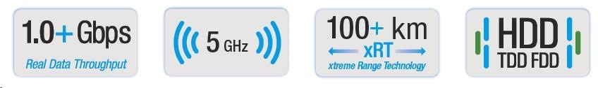 Současně nejvyspělejší technologie páteřního spoje v pásmu 5 GHz. Díky pokročilým technologiím HDD, eXtended Range, modulaci 256QAM komunikuje rychlostí až 1 Gbps.