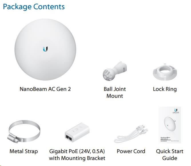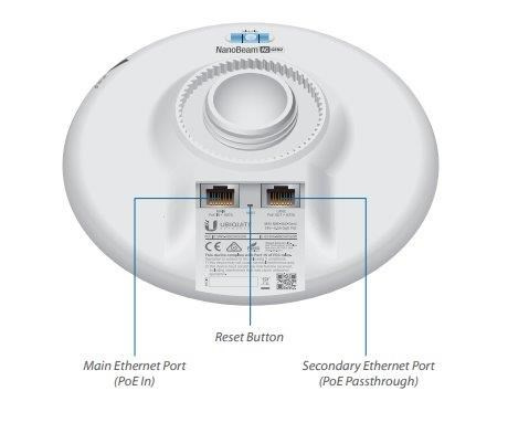 Uvnitř NanoBeamu se nachází výkonný MIPS procesor Atheros 74KC s frekvencí 720MHz, kterému sekunduje 128MB operační paměti typu DDR2 a 8MB Flash paměť. Síťový port podporuje 10/100/1000 Ethernet a lze po něm jednotku napájet pasivním Gigabit PoE 24V/0,5A adaptérem, které je součástí balení (aktivní PoE dle 802.3af není podporováno).