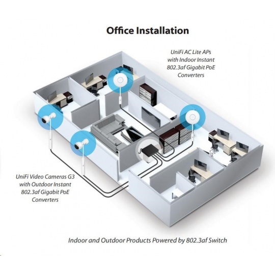 Pomocí tohoto gigabitového konvertoru je možné napájet jednotky UBNT switchem s aktivním PoE dle 802.3af (48V). Konvertor komunikuje se switchem dle 802.3af a do výstupu propouští již klasické pasivní PoE, v tomto případě 24V/0,5A. Lze použít se všemi jednotky od Ubiquity (je kompatibilní i s routerboardy od Mikrotiku).