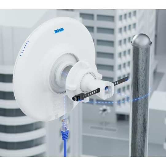 5 GHz wireless bridge with PoE output that connects at 5+ km distances or seamlessly uplinks to UniFi WiFi.  Link at 5+ km distances with a point-to-point connection to another Device Bridge Pro, or uplink seamlessly with UniFi WiFi Auto-Link   (2) GbE ports with (1) PoE output for PoE devices   Powered using PoE/PoE+*   Pole mounting   Weatherproof (outdoor exposed)   Sold as a single unit  Note. Cannot be set up standalone and must be managed by a UniFi Console, Official UniFi Hosting, or a Self-Hosted UniFi Network Server.  *PoE adapter included. PoE+ input required for PoE passthrough..