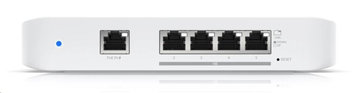 UniFi Switch Flex XG od Ubiquiti Networks je plně managovatelný L2 UniFi Switch s (4) 10Gb ethernetovými porty a (1) Gigabit LAN podporující PoE IN (802.3af). Velmi kompaktní a bezventilátorové desktop provedení doplňují informační LED diody indikující stav linky. Switch je možné napájet přes první port pomocí PoE IN nebo přes USB-C na zadní straně.