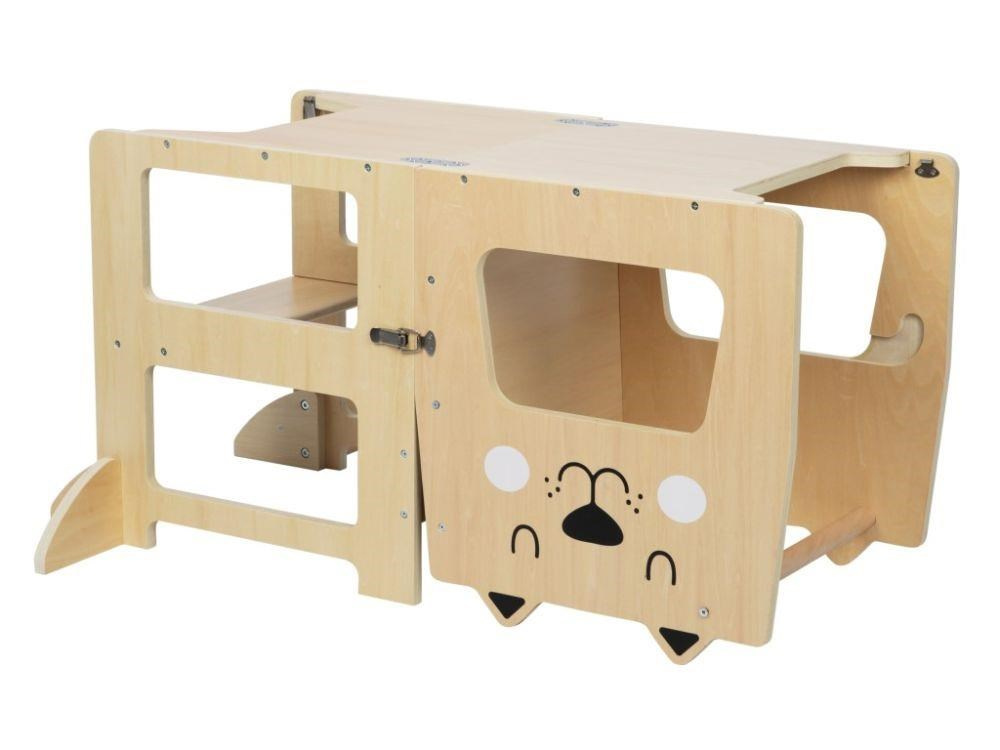 Multifunkční učící věž 4v1 je nepostradatelným pomocníkem do domácnosti s malými dětmi. Učící věž Lvíček představuje dětský nábytek i hračku v jednom a potěší holčičky i chlapce. Může být klasickou učící věží v podobě roztomilého zvířátka, může představovat schůdky, originální set dětského nábytku (dětský stolek se židličkou) a zároveň je i kreslící tabulí, na kterou si děti mohou malovat křídami.