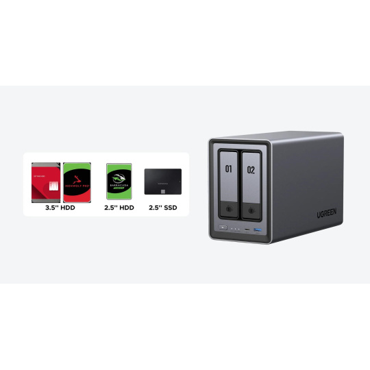 UGREEN NAS je kompatibilní s extrémně širokou škálou úložných disků, včetně 3,5„/2,5“ SATA disků a M.2 SSD. Podporovány jsou všechny nejoblíbenější značky pevných disků a neexistuje žádné omezení na konkrétního výrobce.