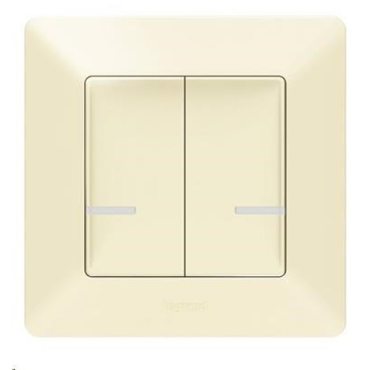 Valena Life with Netatmo dvojitý bezdrátový spínač osvětlení (baterie CR2032 a oboustranná lepenka součást balení) pro ovládání až 20 drátových přístrojů (spínačů/stmívačů, zásuvek, mobilních zásuvkových adaptérů, kabelových výstupů a mikromodulů pro osvětlení). Zadní strana je zcela plochá (lze montovat na zeď, sklo, nábytek pomocí šroubů nebo oboustranné lepenky) - barva Béžová, dodáván s rámečkem v barvě Béžová